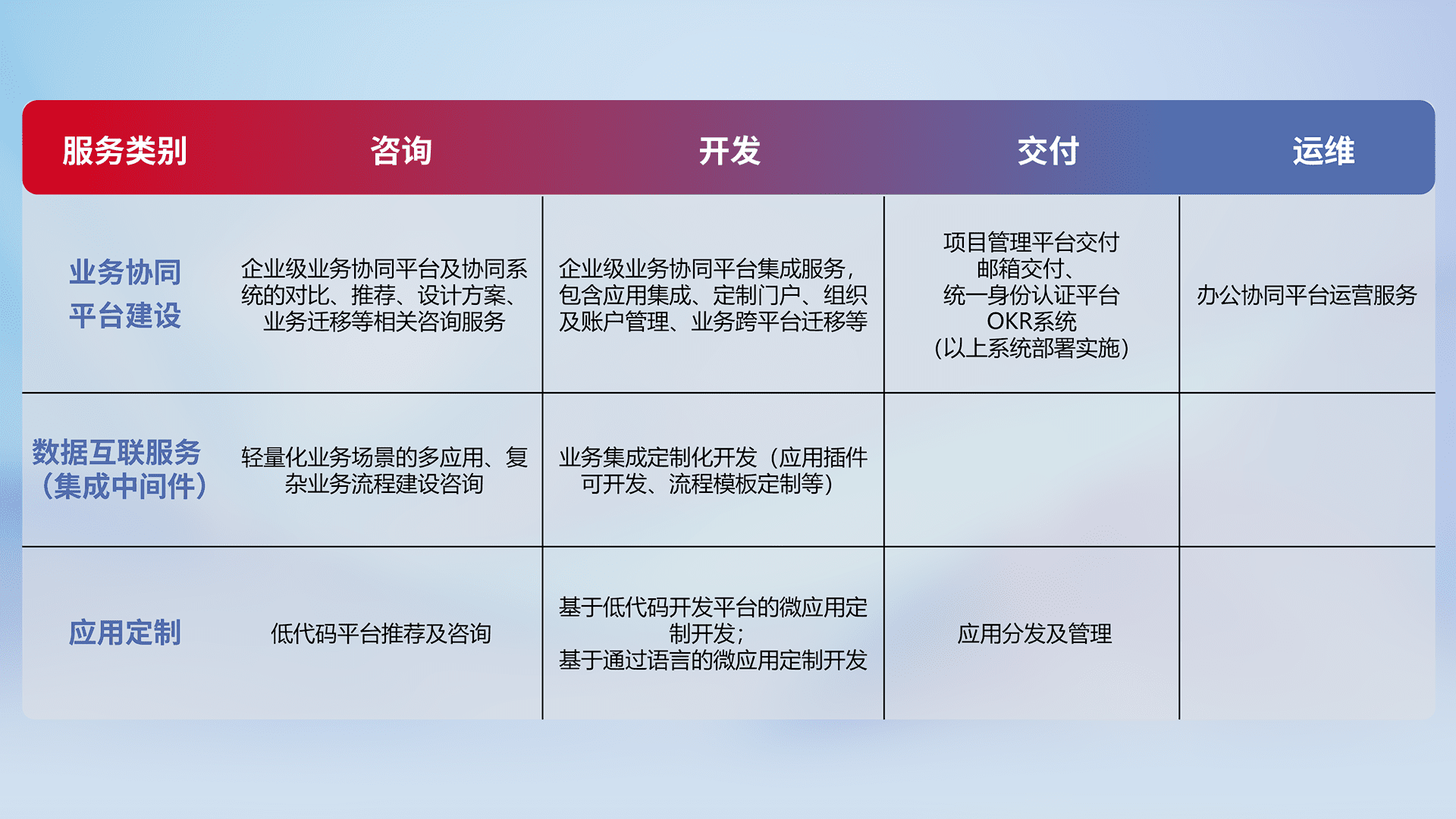 针对钉钉、、、企微、、、、IDaas等平台级产品提供产品的规划、、、、方案、、、、交付、、定制化开发等服务,,,实现如统一协同办公、、、、智能客户服务、、、混合会议管理、、、、智能数据查询、、、等业务场景,,实现数字化转型。。。。